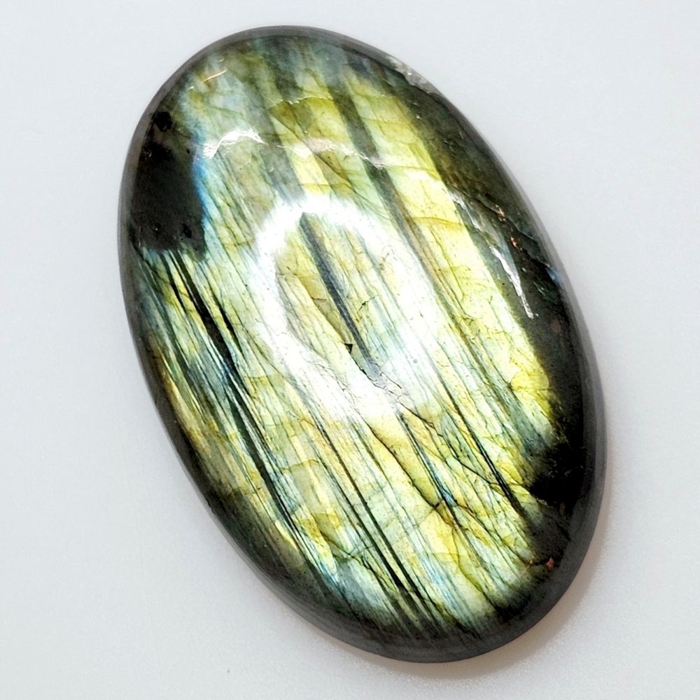 Labradorite Oval Gemstone Cabochon (N) Approximate size 25.8 x 42.67mm, 8.9mm thick. One piece as shown.