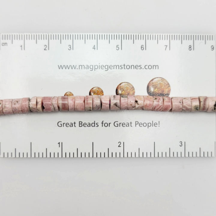 Rhodochrosite Heishi Gemstone Beads (N) Approximate size 6 to 6.8mm, 2.1 to 5.2mm thick. 16 inches.